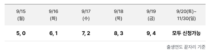 | 요일 | 신청 가능 출생연도 끝자리 |