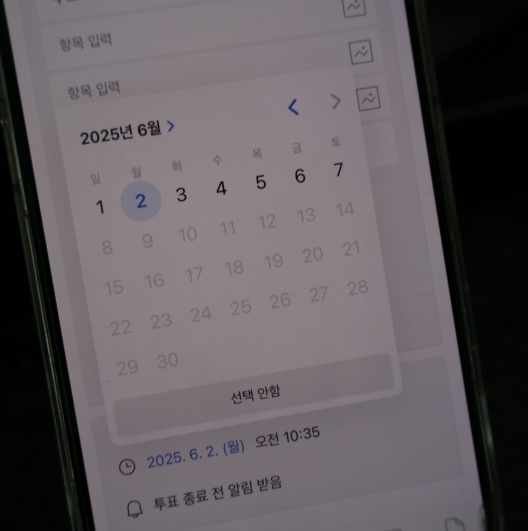 - 투표 제목 입력 (예: “다음 주 회식 날짜는?”)