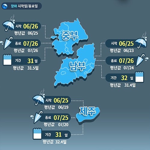 - 중부지방: 6월 25일 ~ 7월 26일 (약 31일)