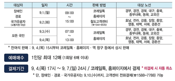 - 9월 1일(월) 09:00 ~ 코레일톡 및 홈페이지 예매 가능