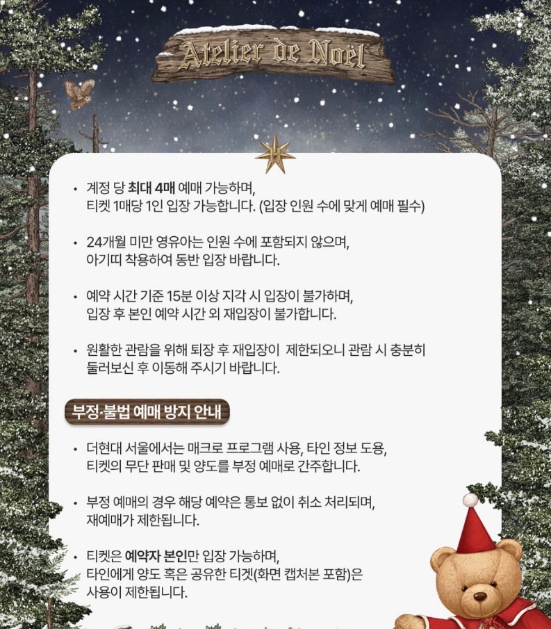 - 계정당 최대 4매 예약 가능. (24개월 미만 영유아는 인원 제외)