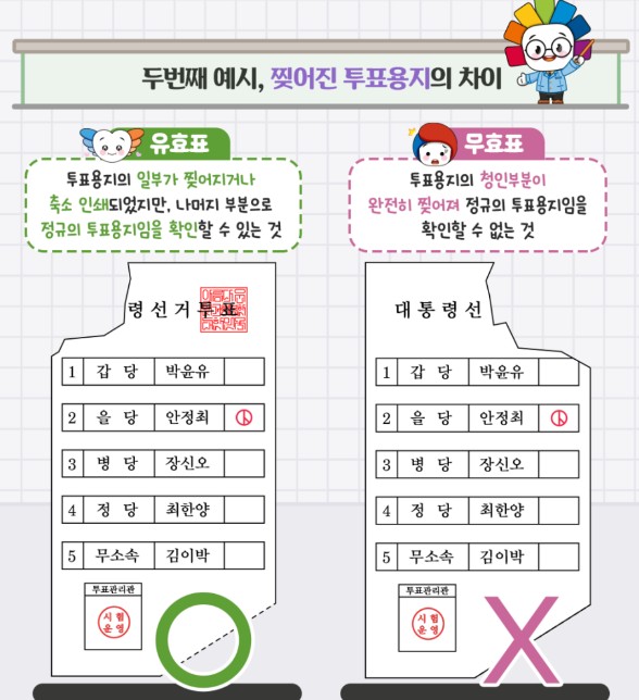 - 투표용지 훼손, 낙서, 접는 방식으로 인한 도장 번짐: 투표용지를 훼손하거나 낙서하면 무효입니다.