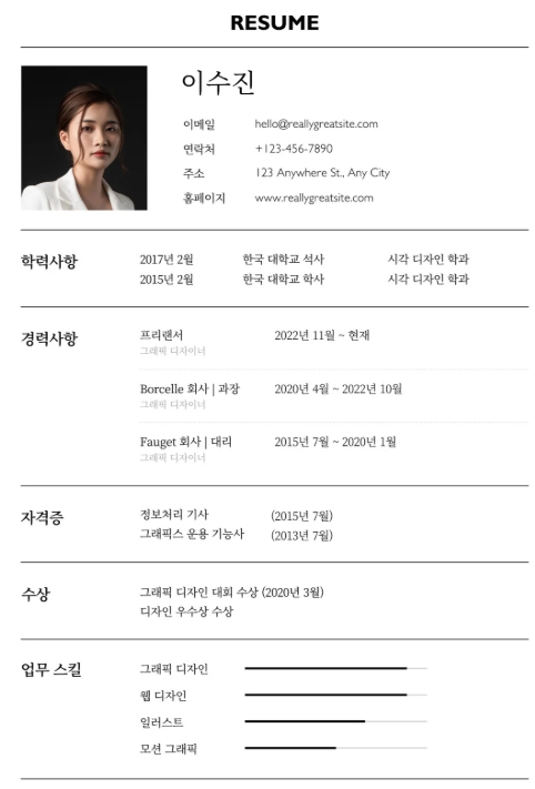 | 디자인형 | 색상·아이콘·그래픽 요소 포함된 포맷 | 창의직군·마케팅·디자인 지원 시 시각적 인상 강화 |
