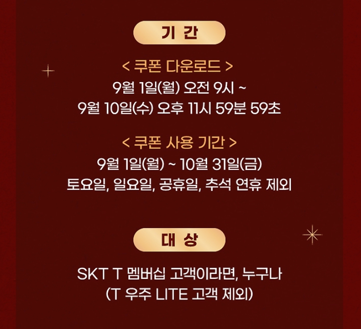 쿠폰은 9월 1~10일 T멤버십 앱에서 다운로드, 10월 31일까지 평일 사용 가능합니다.